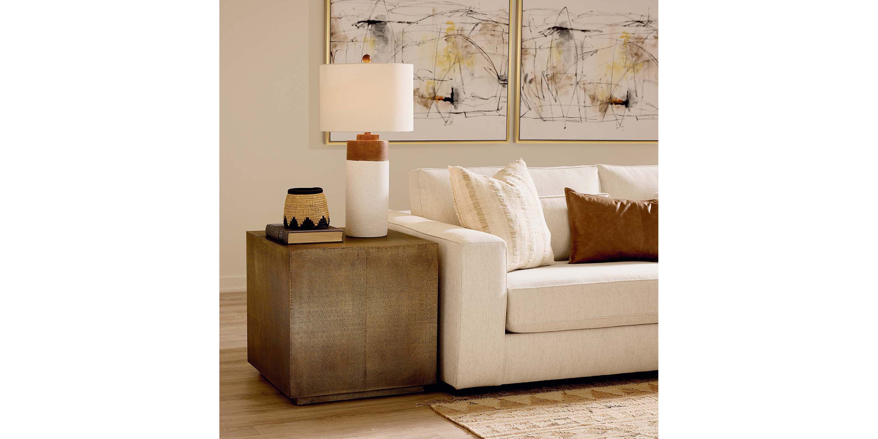 The Vansant cube end table with a sleek, structure-like design with a rough-hewn finish adds a modern classic style to any space. Add dimension to your room with the table as it sits atop a recessed base, giving it a floating effect. Covered in copper and zinc alloy cladding, powder coated in a brass finish. The hammered texture is done by hand giving each table a unique appearance and one-of-a-kind character.